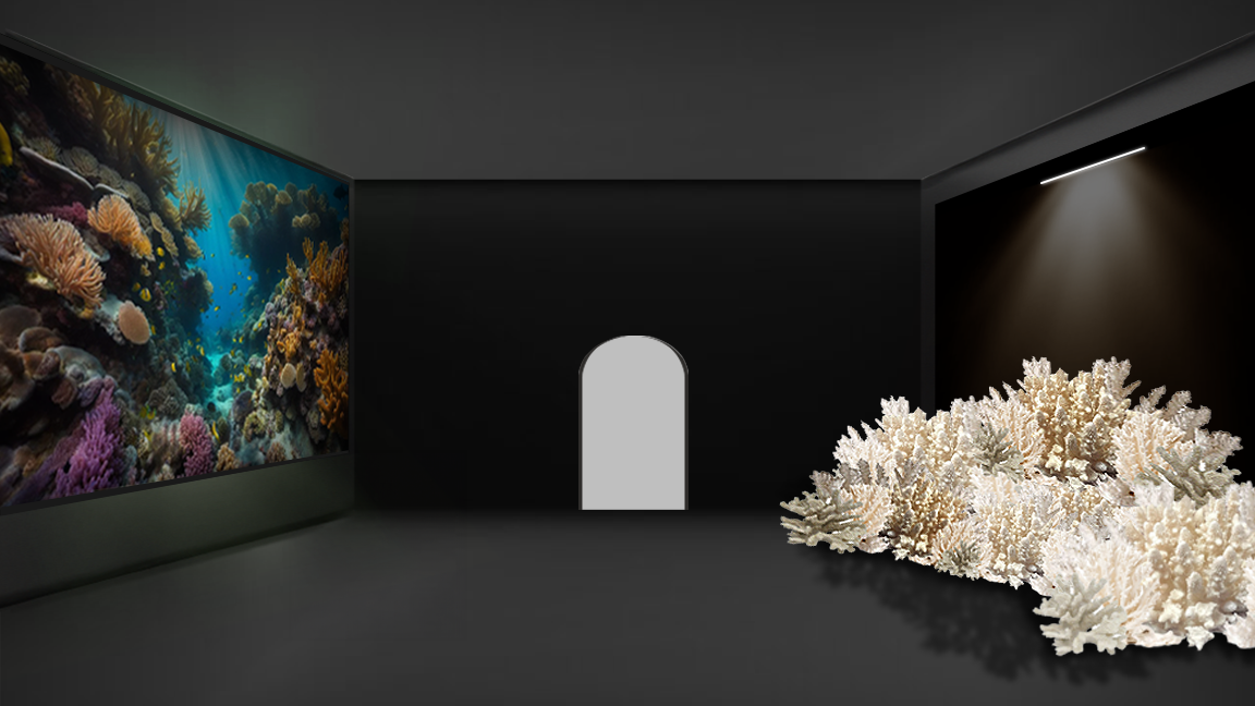 On one side of the experience, visitors are immersed in a vibrant, thriving coral reef, alive with color and movement. On the opposite side, they encounter a stark contrast: a lifeless, bleached coral reef that they can physically touch. This room serves as a powerful reminder of the devastating impact of human actions on our environment.